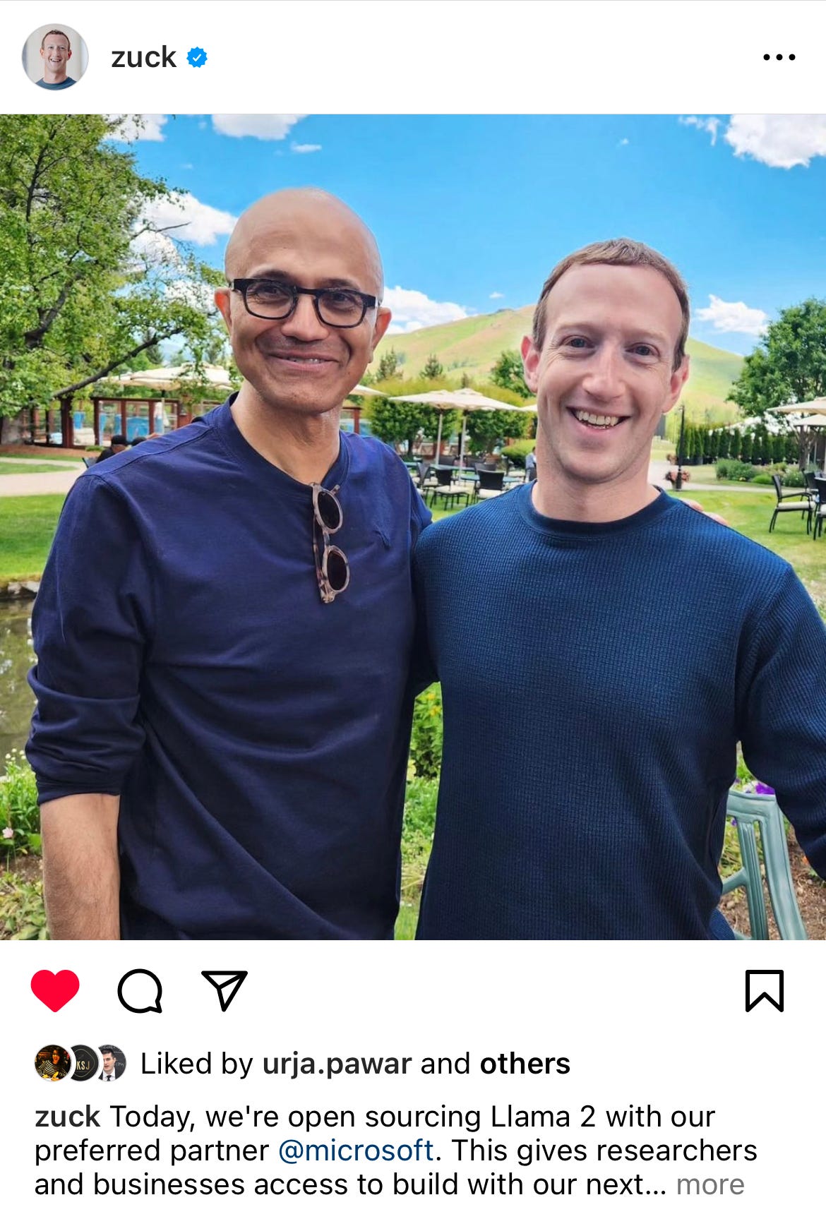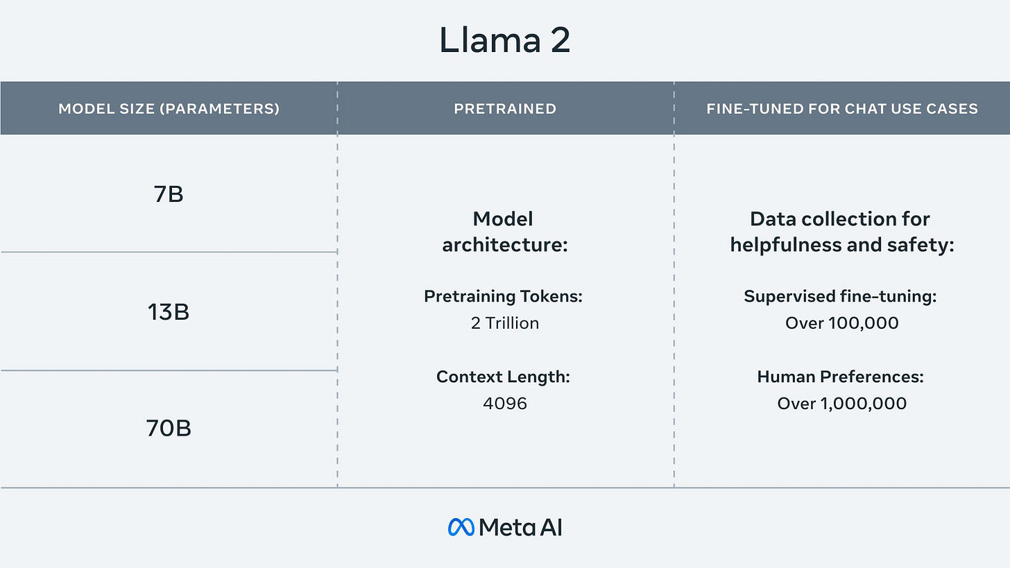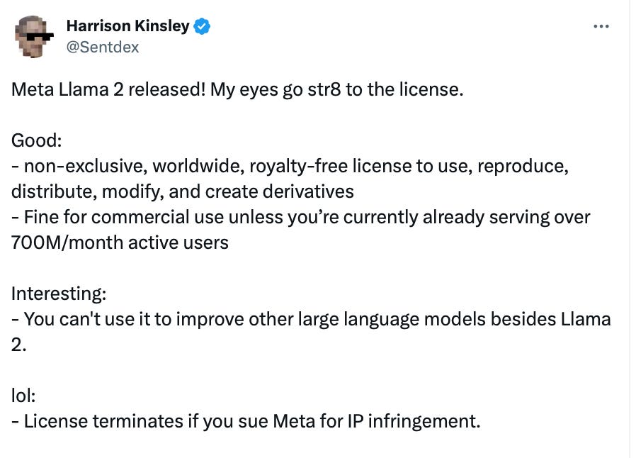 🔹 This pumps Meta onto the AI scene. With this announcement, Zuck is signaling how strong Meta's AI position is. They will now own one of the most widely adopted LLMs + have one of the best training data sets in the world.