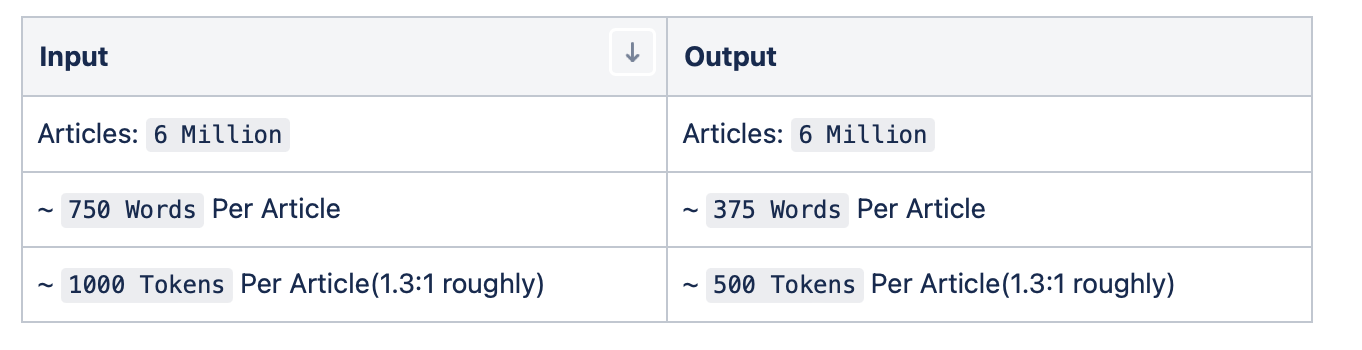 Output Tokens - 3 Billion: 6 Million Articles with 500 tokens)