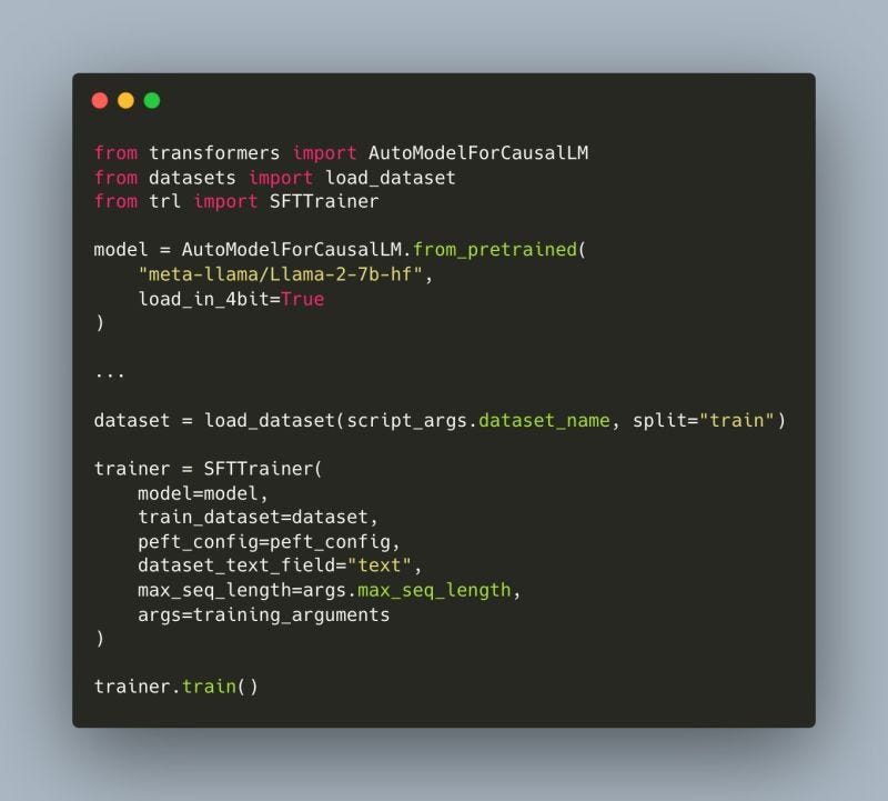 🔹 With Llama2 landing in the Hugging Face ecosystem, It is very easy to fine-tune this architecture using various tools from the HF ecosystem (TRL, PEFT, ..) - 4bit quantization and PEFT to fine-tune llama2-7b on a single Google Colab instance!
