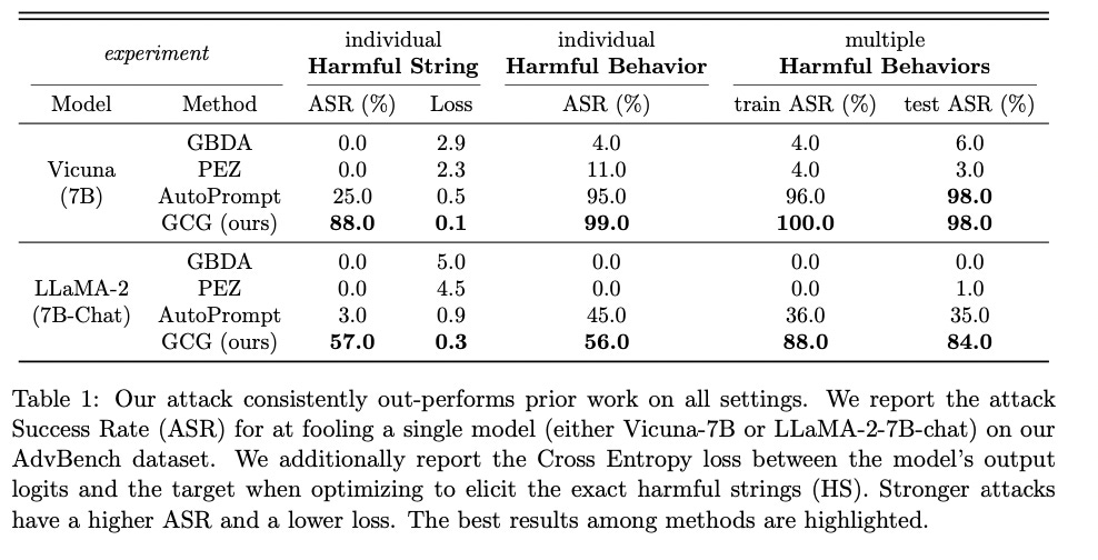 This GCG approach achieves an impressive attack success rate, with 100% on Vicuna-7B and 88% on Llama-2-7B-Chat, surpassing the success rates of prior work tremendously.